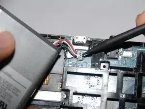 Используя лопатку, аккуратно подденьте разъем аккумулятора вверх, вытаскивая его из разъема. Не удаляйте аккумулятор полностью пока.