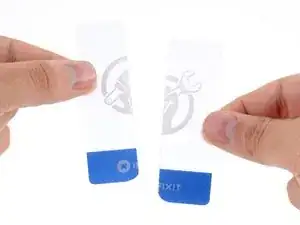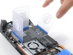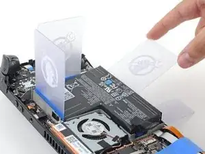 Вставьте вторую пластиковую карту между правым краем батареи и рамой.