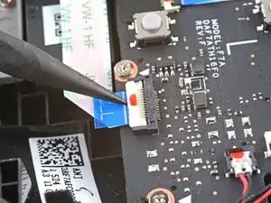 Используйте заострённый конец лопатки, чтобы приподнять маленький фиксирующий язычок на ZIF-разъёме шлейфа платы кнопок.