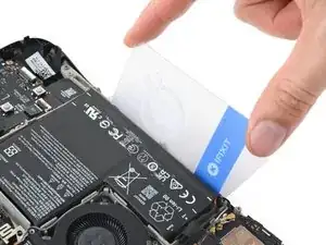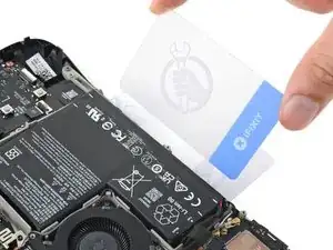 Если аккумулятор всё ещё кажется застрявшим, скрутите и подденьте две половинки первой пластиковой карточки, чтобы помочь отделить оставшийся клей.