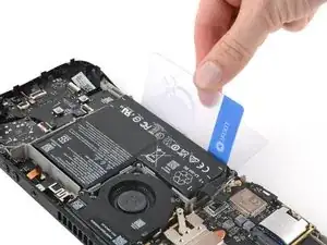 При сборке используйте плоский конец лопатки, чтобы сдвинуть разъём аккумулятора в гнездо на материнской плате.