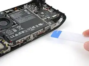 Используйте лопатку, чтобы отогнуть маленький белый фиксатор справа на ZIF‑разъёме межплатного кабеля кнопочной платы.