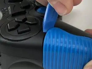 Используйте пластиковую инструмент для вскрытия, чтобы снять синие резиновые накладки с боковых сторон контроллера.