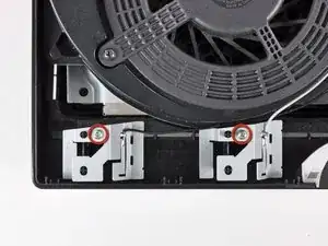 Выкрутите два винта Phillips длиной 7,6 мм, крепящих блок питания к нижней крышке.