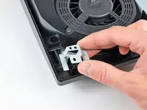 Продолжайте поднимать левый край блока питания, пока он не снимется с двух металлических штырей, показанных на втором изображении.