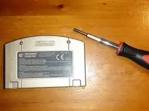 Теперь к основной части. Начните с установки наконечника Gamebit 3.8 мм в модульную отвёртку. Используйте отвёртку, чтобы выкрутить два винта Gamebit, удерживающие картридж. После откручивания аккуратно снимите заднюю крышку картриджа, чтобы открыть внутренний металлический экран.