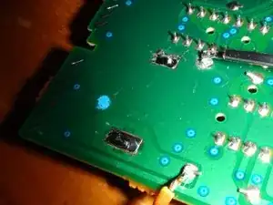 Теперь нагрейте клеммы резисторов (обведённые зелёным на шаге 5) до тех пор, пока припой на них не начнёт плавиться. ВНИМАНИЕ: Снова следите за температурой клемм. Вы не хотите повредить резисторы или саму плату. Также чрезмерный нагрев может увеличить сопротивление на линии питания от батареи и привести к потере данных SRAM.
