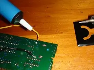 Начните нагревать одну из клемм, к которой подключён кабель резервной батареи. Убедитесь, что вы нагреваете контакт резистора, клемму и конец кабеля резервной батареи одновременно. Пока припой нагрет, аккуратно потяните за кабель, пока он не освободится.