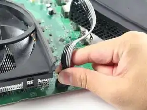 Захватите разъём, как показано, зажмите маленькую чёрную фиксирующую защёлку и сильно потяните вверх, чтобы отсоединить блок питания от материнской платы.