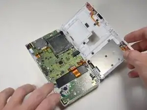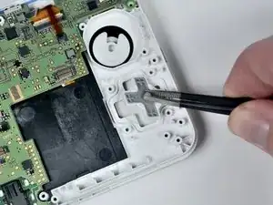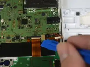 Плоской стороной лопатки отсоедините ленточный кабель от разъёма, расположенного слева от джойстика.