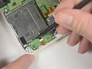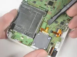 Пластиковым инструментом отсоедините ленточный кабель SD-карты от разъёма на материнской плате.