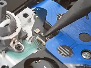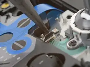 Используйте острый конец лопатки, чтобы поднять чёрную фиксирующую защёлку на ZIF‑разъёме левого джойстика.