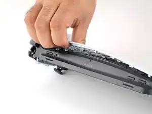 Задняя крышка всё ещё зафиксирована множеством защёлок. В следующих шагах показано, как отщёлкнуть крышку, минимизируя риск повреждения защёлок.