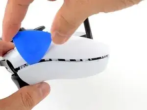 Вставьте наконечник пластикового медиатора под декоративную полоску левого джойстика там, где она огибает нижнюю часть рукоятки.