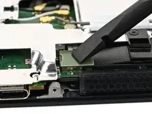 Осторожно поднимите наклейку над разъёмом Joy‑Con 2, затем полностью отклейте её и снимите.