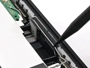 Просуньте одно плечо изогнутого пинцета под наклейку из её выреза вокруг разъёма правого Joy‑Con 2.