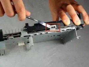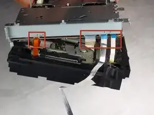 Осторожно извлеките оранжевый ленточный кабель из лазера, аккуратно потянув за белую пластиковую полоску.
