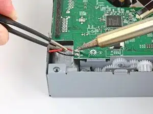 Используйте паяльник, чтобы распаять красный провод в углу платы дисковода.