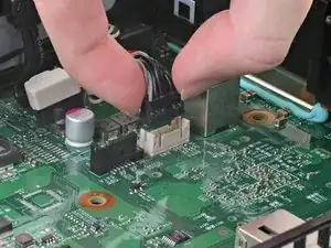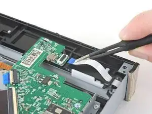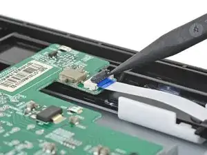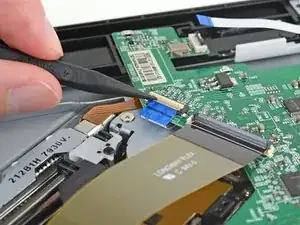 Используйте заостренный конец лопатки, инструмент для вскрытия или ноготь, чтобы откинуть маленький шарнирный фиксатор на ленточном кабеле в ZIF-коннекторе на передней плате.
