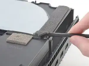 Вставьте плоский конец лопатки под тёмно‑серую поролоновую ленту, начиная с угла, ближайшего к блоку питания и к краю консоли.