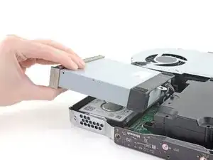 Разместите дисковод на верхней металлической крышке так, чтобы он оказался над жёстким диском. Вам понадобится достаточно места, чтобы отсоединить блок питания от материнской платы.