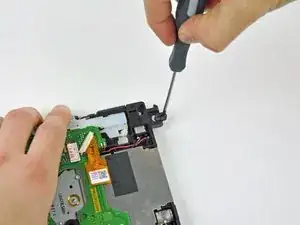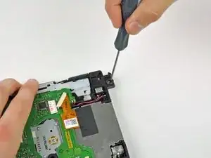 Удалите два оставшихся винта Phillips длиной 4,1 мм вдоль верхнего края чёрной пластиковый рамки порта контроллера.