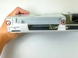 С каждой стороны консоли удалите по одному крестообразному винту Phillips #0 длиной 3.5 мм, соединяющему DVD-привод с передней панелью.