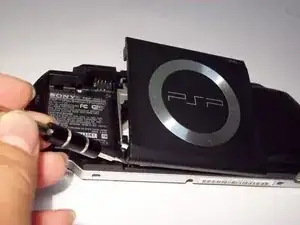 СНАЧАЛА, при ориентированной вверх PSP, открутите чёрный винт внизу справа от дверцы UMD рядом с правым динамиком — это облегчит последующее поддевание дверцы UMD.