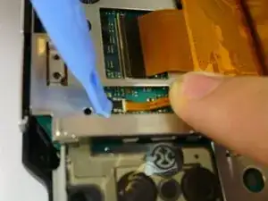 Тонкий плоский кабель открывается с противоположной стороны от той, в которую он входит. Откройте защёлку в сторону от кабеля. Защёлка поднимется и освободит кабель. Поместите инструмент за чёрную часть, затем подденьте чёрную пластиковую деталь.