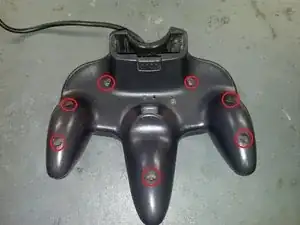 Начните с удаления 7 винтов Phillips #0 с задней части рукояток контроллера, как показано.