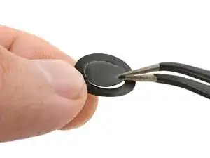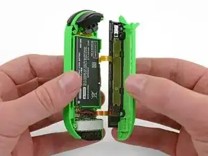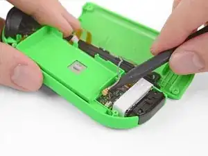 Вставьте лезвие демонтажа между батареей и корпусом Joy-Con. Аккуратно подденьте батарею, которая слегка приклеена лентой.