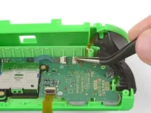 Кабель кнопки ZR зафиксирован малым ZIF-разъёмом на плате. Используйте пинцет или лопаточку, чтобы откинуть фиксатор ZIF.