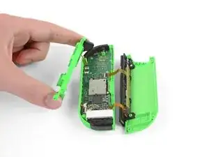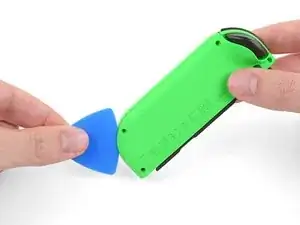 Будьте осторожны, чтобы не ввести лезвие демонтажа слишком глубоко в корпус Joy-Con. Это может повредить внутренние компоненты. Задняя панель имеет мелкие защёлки по стороне, противоположной зарядной направляющей. Они ослабляются довольно легко, поэтому не требуется большого давления.