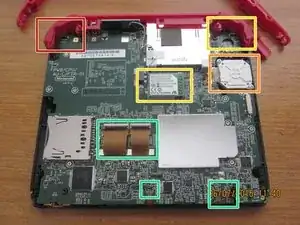 Снимите материнскую плату и верхнюю цветную деталь.