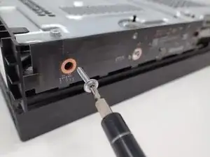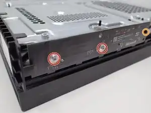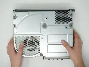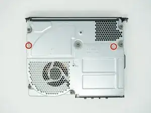 Используя отвёртку Torx T10, выкрутите два винта, расположенные по противоположным сторонам металлического кожуха. Один рядом с вентиляцией вентилятора, другой — рядом с вентиляцией блока питания.