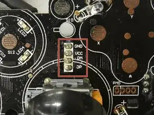 Кабель подключается к логической плате через белый разъём. Над правым джойстиком расположены четыре контактные площадки для пайки, обозначенные GND, VCC, DM и DP.