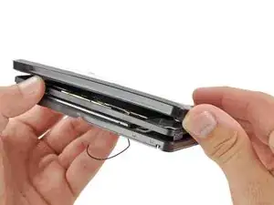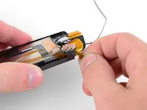 Используйте пинцет из металла, чтобы снять чёрное металлическое кольцо петли с рамки верхнего дисплея.