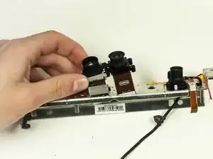Снимите две камеры слева (которые соединены между собой), протянув их ленточные кабели через соответствующие прорези.