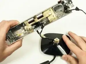 Аккуратно снимите верхнюю часть корпуса Kinect со стойки, пропустив кабель через отверстие на нижней стороне корпуса, затем поднимите корпус с пластиковой стойки.