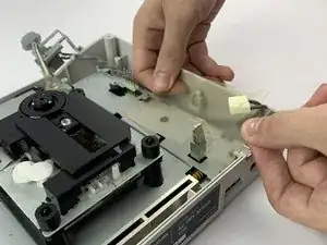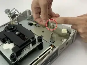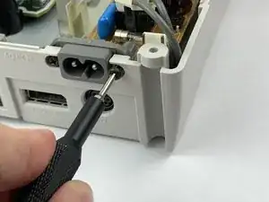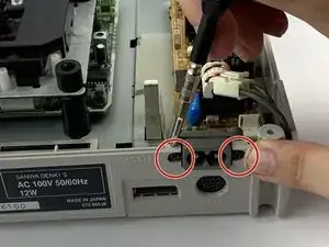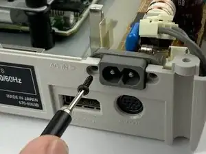Снимите два чёрных винта-стоянки длиной 11,4 мм на задней части Sega Saturn, удерживающие разъём питания. Эти винты сильно затянуты и легко срываются, поэтому рекомендуется использовать насадку для винтов стоек.
