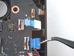 Или используйте плоский конец лопатки (spudger) или чистый ноготь, чтобы аккуратно выдавить разъём из гнезда, затем полностью отсоедините его вручную.