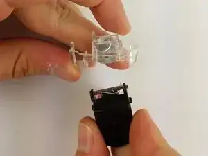 Плотно захватите прозрачный пластиковый корпус триггера одной рукой и другой рукой вытяните чёрную кнопку триггера из её корпуса.