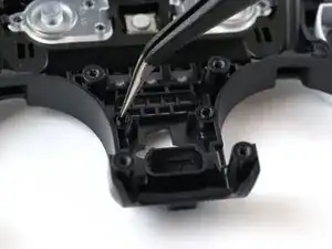 Используйте пинцет, чтобы отсоединить ленточный разъём задней кнопки RB от материнской платы, схватив синюю вкладку на ленточном кабеле и потянув от разъёма.