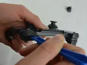 Подденьте кнопку контроллера пластиковым инструментом для открытия. Просуньте инструмент между кнопками. Там будет защёлка, которую можно нажать, чтобы снять кнопку.