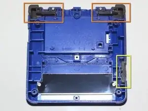 Триггеры L&R (оранжевый квадрат) и элемент переключателя питания (желтый квадрат) прикреплены к задней крышке.