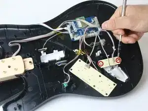 Используя отвертку с головкой J1, удалите два черных винта длиной 5 мм под белой панелью. Теперь вы сможете разобрать гитару.