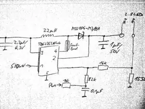 Поэтому я разобрал устройство и поискал следы воды. Я нашел следы прямо на цепи управления светодиодами. После очистки и проверки плавкой предохранителя на 0,5 А (всё в порядке) я решил выяснить, какой элемент вышел из строя. Мне потребовалось некоторое время, чтобы найти подходящий чип. Это был светодиодный драйвер TB62752AFUG. Это преобразователь повышающего напряжения с выходным током. Он может выдавать до 40 В.