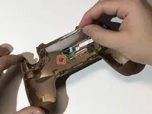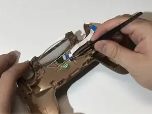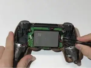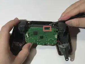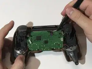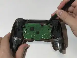 Вставьте инструмент для раскрытия в созданный зазор и проведите им вдоль складки, чтобы ослабить защёлки, расположенные возле кнопок плеча и аналоговых стиков.