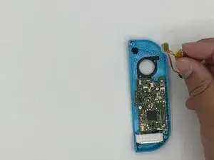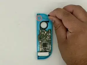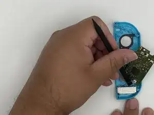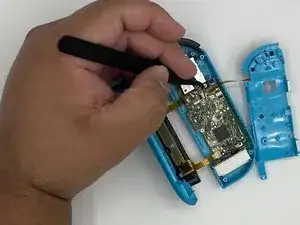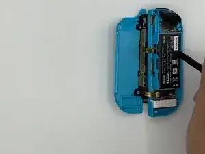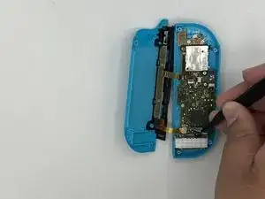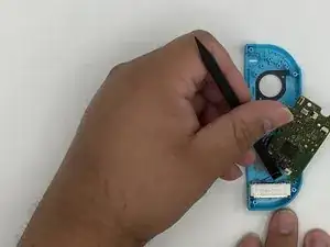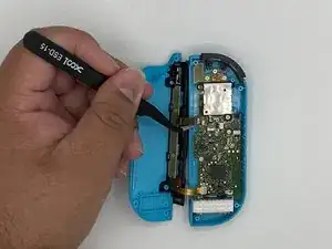 Осторожно подденьте разъём батареи вертикально вверх от его гнезда на плате с помощью пластиковой лопатки (избегайте металлических инструментов, чтобы снизить риск замыкания). Это предотвратит включение Joy-Con во время ремонта.
