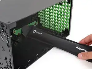 Если кабель USB‑порта кажется приклеенным к металлическому шасси, используйте iOpener или фен, чтобы нагреть кабель. В зависимости от модели Xbox, возможно, потребуется поддеть кабель открывающей пластиковкой лопаткой, чтобы отделить клей.